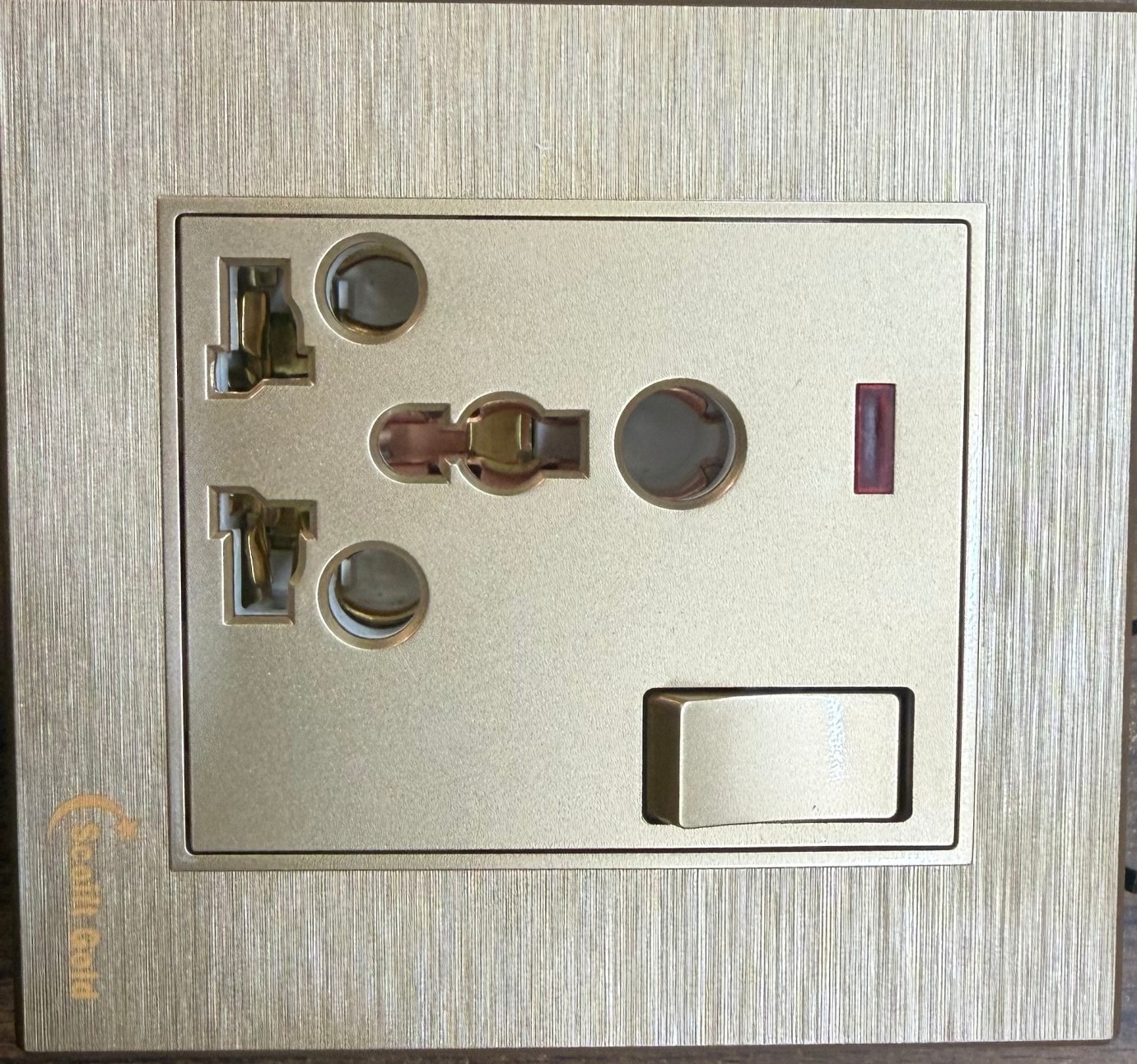 The Gold 16A Universal Power Socket is a premium modular electrical outlet designed for safe and reliable power delivery in homes, offices, and commercial spaces. Built with FRLS (Fire Retardant Low Smoke) material and pure copper internal contacts, it ensures superior conductivity, reduced heating, and long service life. Its universal design supports multiple plug types, while the elegant gold finish enhances modern interior aesthetics. Technical Specifications Rated Current: 16 Amp Rated Voltage: 250V AC Contact Material: Copper Points Mechanical Life: Up to 40,000 operations Size: 3×3 Modular (Standard Plate Fit) Material: FRLS Fire-Resistant Body Color: Premium Gold Finish